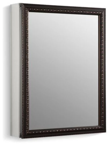 Showcasing elegant bronze detailing on its frame, this wall-mounted medicine cabinet features a reversible door that can be installed with a left- or right-hand hinge. Mirrors are positioned on the front and back of the door as well as the interior back of the cabinet. Two adjustable glass shelves hold your toiletries and bath items. Durable aluminum construction makes this cabinet rust- and rot-resistant.