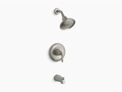 Designed to capture the essence of a bygone era, Devonshire faucets and accessories bring a versatile, traditional style to the bathroom. This bath and shower trim includes a showerhead with Katalyst air-induction spray. By infusing two liters of air per minute, Katalyst delivers a powerful, voluptuous spray that clings to the body with larger, fuller water drops. Pair this trim with a Rite-Temp pressure-balancing valve, which maintains your desired water temperature during pressure fluctuations.