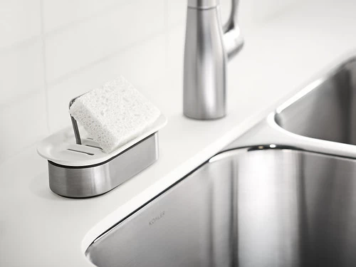 Create a clean, clutter-free look in your kitchen sink area. This sponge caddy includes a removable slotted tray, so water drips through to the container below and your sponge air-dries more quickly. The sleek stainless-steel design complements any kitchen decor.