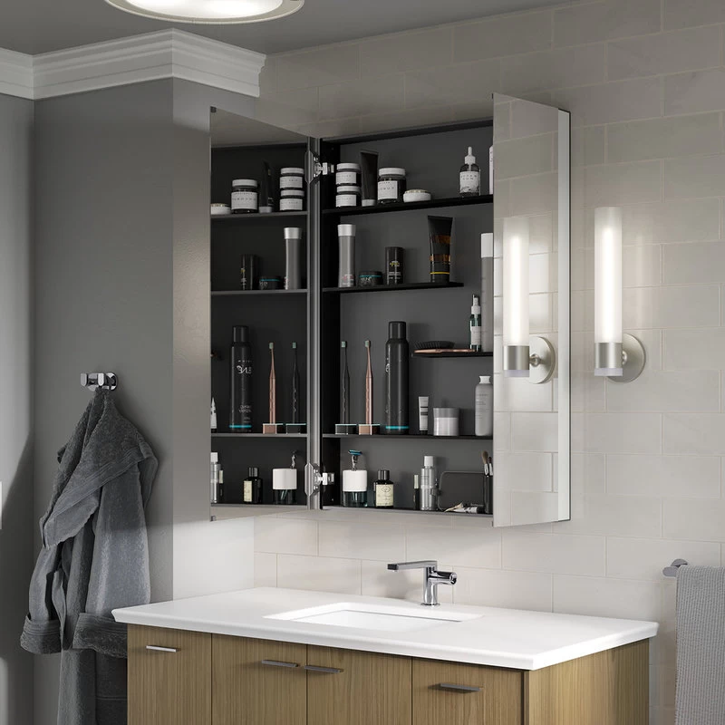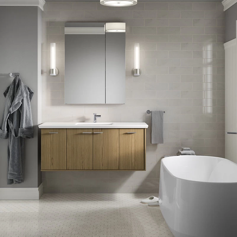 Maximize your bathroom storage with the Maxstow medicine cabinet. Staggered shelving holds tall and short items with no wasted space, fitting everything you need and keeping clutter off your countertop. The slim 3-1/2″ deep design provides the same internal storage space as traditional 5-in-deep cabinets. Installation is fast and easy—simply screw to the wall, right out of the box.Kohler K-81149 Features: