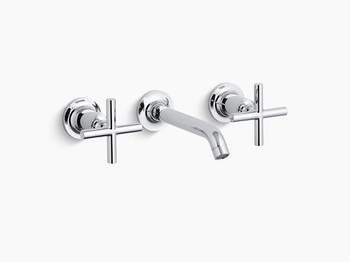 Capturing the style of minimalist design, Purist faucets deliver streamlined water control. This sink faucet trim features a 35-degree angled spout and cross handles for easy operation. The convenient wall-mount design provides a clutter-free countertop in your bath or powder room. When paired with a two-handle ceramic disc valve, this trim offers optimal performance. Combine it with bath accessories from the Purist collection for a distinctively modern and unified decor.
