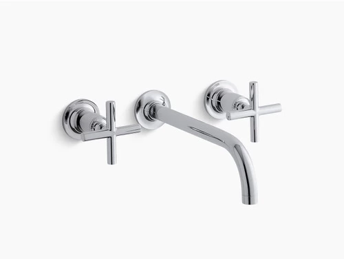 Capturing the style of minimalist design, Purist faucets deliver streamlined water control. This sink faucet trim features a 90-degree angled spout and cross handles for easy operation. The convenient wall-mount design provides a clutter-free countertop in your bath or powder room. When paired with two-handle ceramic disc valves, this trim offers optimal performance.