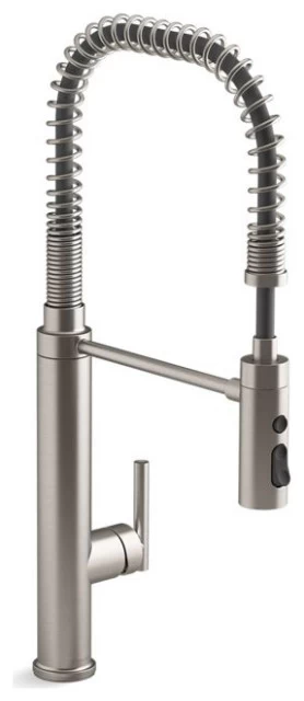 - Professional-style faucet with an easy-to-clean coated hose and removable coil.