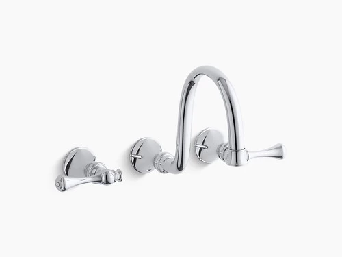 Blending European style and early American influences, Revival faucets and accessories bring continuity to your bathroom design. This bathroom sink faucet trim features a gracefully arched spout and traditional-style lever handles in a space-saving wall-mount design–an elegant choice for vessel sinks or sinks without faucet holes. Pair this trim with a two-handle ceramic disc valve for optimal performance.