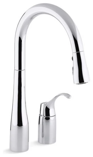 An innovative fit for a variety of kitchens and tasks, this Simplice pull-down kitchen faucet combines an elegant, universal design with exceptional ergonomics and functionality. The high-arch spout rotates 360 degrees and reaches over the tallest pots, while the smoothly maneuvering sprayhead pulls down into the sink for up-close tasks, or out of the sink to fill pots. Sculpted buttons on the sprayhead ensure simple operation even with wet, soapy hands. Sweep(TM) spray creates a wide, forceful blade of water for superior cleaning. KOHLER’s new docking system, DockNetik(R), secures the pull-down sprayhead to the spout using magnetic force.