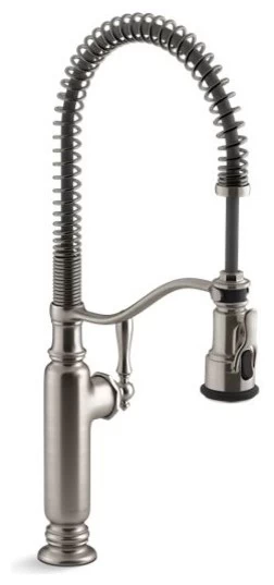 Designed with ambitious home chefs in mind, the Tournant faucet delivers elegant styling and professional performance to your kitchen. A unique three-function sprayhead lets you speed through a range of tasks: BerrySoft(R) spray for food prep; an aerated stream for filling pots and pitchers; and Sweep(R) spray for cleaning. The high-arching coil spring removes for easy cleaning.
